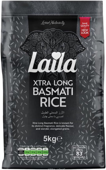 Laila Extra Long Grain Rice 5 Kg - 100 % Gluten Free - Extra Long Grain White Basmati Rice with Aroma Fragrant, Package May Vary